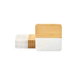 Conjunto de 4 porta copos em mármore e bambu em formato quadrado. Cada peça individual está dividida, pela sua metade, em mármore e bambu. Fornecido em caixa presente em papel kraft reciclado. Certificação EU Food Grade. A cor e o resultado da impressão nos materiais naturais pode variar entre produtos. 100 x 100 x 10 mm