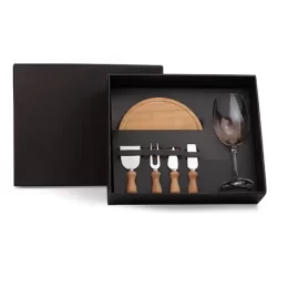 DESCRIÇÃO: Conta com tábua em bambu; duas facas, uma espátula e um garfo para queijo em bambu/inox; taça em vidro com capacidade de 490 ml.