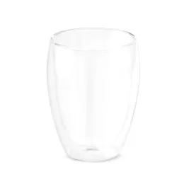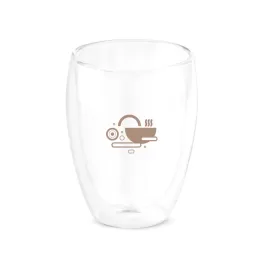 Copo em vidro borossilicato com parede dupla, isolada a ar. Capacidade até 350 mL. Fornecido em caixa presente personalizável. Certificação EU Food Grade. ø89 x 113 mm | Caixa: 95 x 95x 125 mm