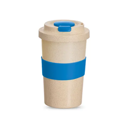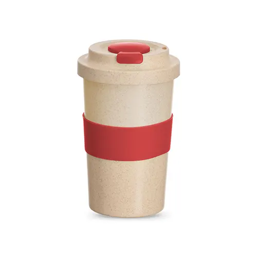 Copo em fibra de bambu com pegador e proteção do bico em silicone, capacidade 450ml. Composição: 30% de fibra de bambu e 70% de PP.