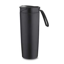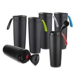 400ml de pintura preto fosco com alça emborrachada colorida. Tampa rosqueável com abertura de bocal, parte inferior do produto possui ventosa.