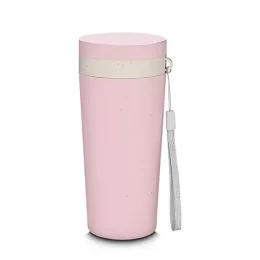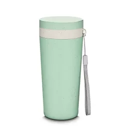 Copo plástico com parede dupla, produzido com fibra de trigo e plástico, com capacidade de 300ml, alça para transporte e tampa rosqueável.