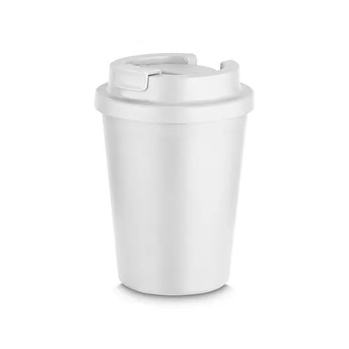 Copo plástico produzido em Plástico RPET, permitindo ir ao microondas, com capacidade de 400ml, tampa rosqueável.