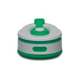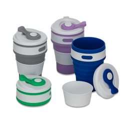 Copo Retrátil 350ml 14246 de silicone, livre de BPA. Tampa plástica de encaixe com abertura para o bocal, acompanha “luva” plástica branca, evitando queimar as mãos com líquido quente – também pode ser utilizada como suporte para sustentação do copo.