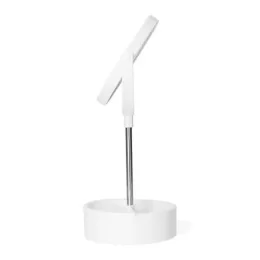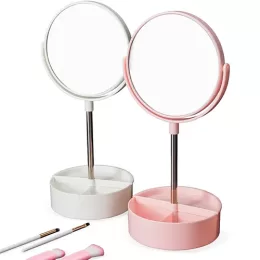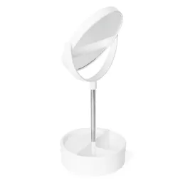 Descrição: Espelho de mesa dupla face giratório com design moderno e funcional. Com base e moldura de plástico e pedestal de alumínio, ele é fácil de montar e adequa-se bem a qualquer ambiente. Sua base contém três divisórias para guardar objetos diversos.