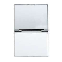 Espelho retangular duplo sem aumento, material em plástico resistente com uma faixa na superfície e verso liso.