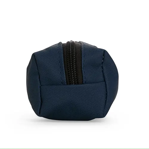Estojo confeccionado em couro sintético com fechamento em zíper e uma pequena alça para fixação em chaveiro ou gancho.