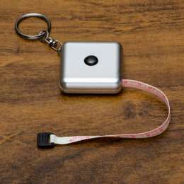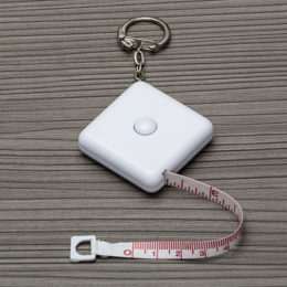 Fita métrica de 1 metro em plástico quadrangular, frente lisa e verso com botão(trava) preto. Acompanha chaveiro.
