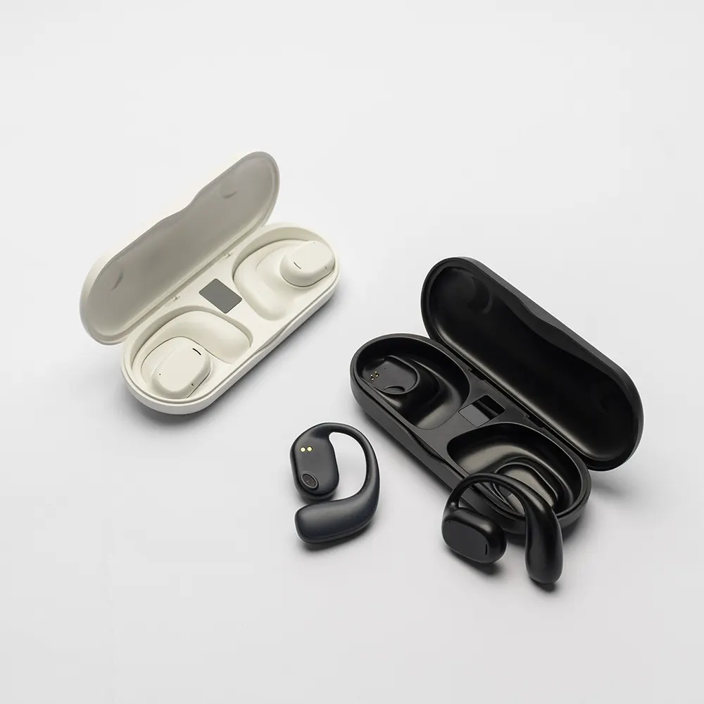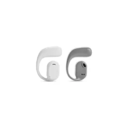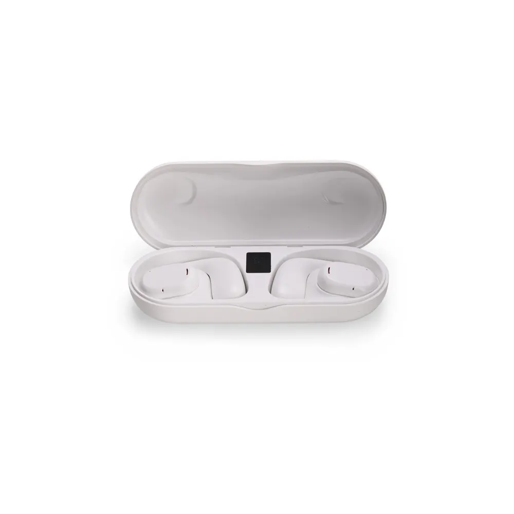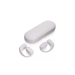 Descrição: Fones de ouvido sem fio com estrutura em plástico. Possuem formato aberto e ergonômico, permitindo o encaixe nas orelhas sem entrar em contato direto com o canal auditivo. Apresenta conexão via Bluetooth 5.3 que oferece uma transmissão de dados mais estável e com maior qualidade. Acompanha estojo de carregamento com visor de percentual da carga total, além de cabo USB-C para recarga.