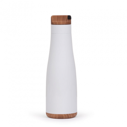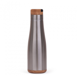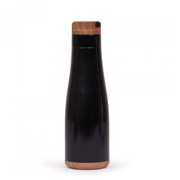 Garrafa aço inoxidável capacidade 750 ml. Parede simples, tampa rosqueável anel vedador de silicone. Alça retrátil em borracha, embutida na tampa. Textura imitação de madeira.