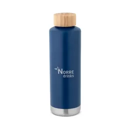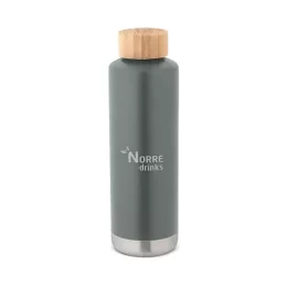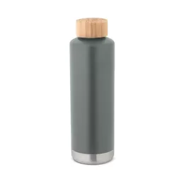 Squeeze em aço inox com parede dupla isolada a vácuo, parede interna revestida de cobre e tampa em bambu com vedante de silicone para proteção extra. Tem capacidade até 640 ml e mantém as bebidas quentes por 16 h e frias por 48 h. Contém revestimento em pó que lhe confere mais durabilidade e resistência. Food grade. Fornecido em caixa presente de papel craft. ø72 x 233 mm