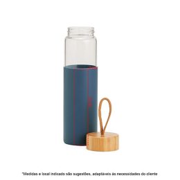 Descrição: Garrafa de vidro borossilicato com capacidade de 750ml. Contém tampa de bambu com alça de algodão e luva de silicone.