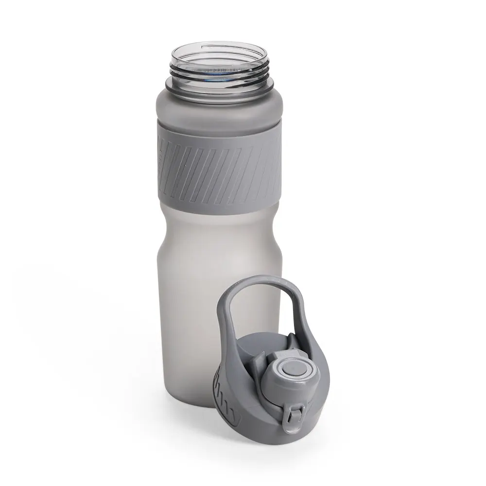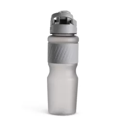 Descrição: Squeeze plástico com acabamento fosco e capacidade de até 750ml. Possui luva emborrachada, tampa rosqueável com bocal e alça fixa para transporte. O bocal conta ainda com uma tampa de proteção com trava de segurança.