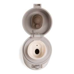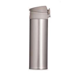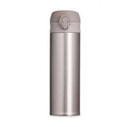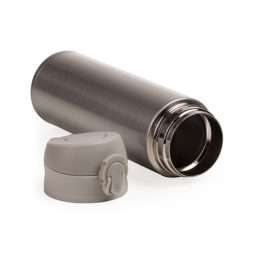 Garrafa Térmica 450ml metal inteira colorida com botão de abertura prata. Possui um sistema de trava (basta mover para cima/baixo para abrir/fechar), pressione o botão centra para abrir a tampa(possui na parte interna borracha protetora evitando vazar o líquido). Para abrir a tampa por completo basta rosqueá-la, parte interna revestida em inox.