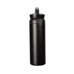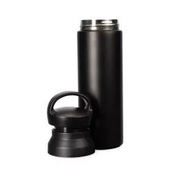 Descrição: Garrafa térmica com capacidade de até 500ml. Conta com estrutura de parede dupla e isolamento a vácuo, o que permite a conservação da temperatura de bebidas por mais tempo. Possui tampa plástica rosqueável com alça para transporte e abertura em duas camadas.