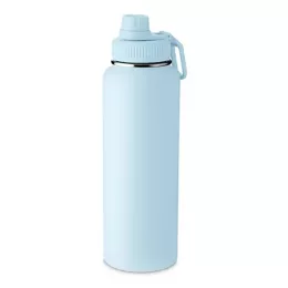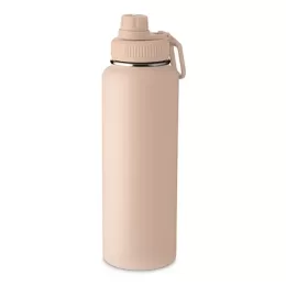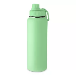 Garrafa térmica em aço inox com parede dupla isolada a vácuo com capacidade de 1,2l. Alça plástica para transporte em formato de mosquetão, bico rosqueável para fácil acesso e tampa rosqueável com anel de silicone com pintura a pó.