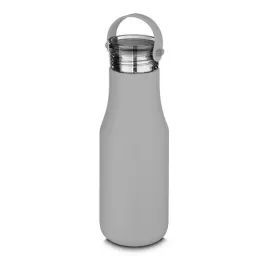 Garrafa térmica em aço inox com parede dupla com capacidade de até 500 ml. Tampa plástica rosqueável, alça em silicone e anel de silicone para vedação. Pintura a pó.