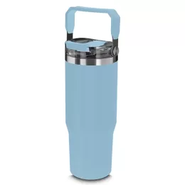 Garrafa térmica em aço inox com parede dupla com capacidade de 950ml parede externa com pintura a pó. Tampa rosqueável com e anel de silicone para vedação. Alça de transporte em plástico. Permite-se hidratar por canudo ou bico.