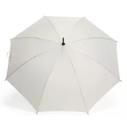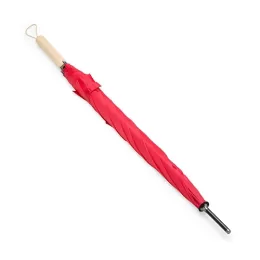 Guarda-chuva com abertura automática, estrutura em aço e 8 varetas em fibra de vidro. Possui pegador de madeira com alça de nylon e botão de acionamento.