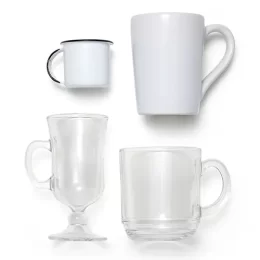 DESCRIÇÃO: Conta com caneca em vidro com capacidade de 300ml, caneca de vidro p/ café com capacidade de 130ml, caneca em cerâmica branca com capacidade de 230 ml e caneca em alumínio branca.