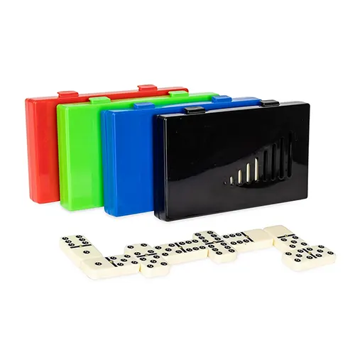 Jogo de dominó com 28 peças com detalhes em relevo. Acompanha estojo plástico com travas de fechamento.