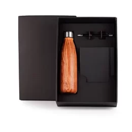 DESCRIÇÃO: Kit de boas vindas. Composto por garrafa em aço Inox com pintura amadeirada, caderno para anotações preto com capa dura e caneta esferográfica em alumínio preta.
