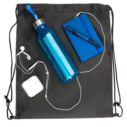 DESCRIÇÃO: Kit boas vindas. Conta com mochila em nylon 420, garrafa pet, fone de ouvido, caderno sem pauta e caneta esferográfica com tampa e ponta touch.