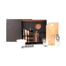 Uma gravação a laser na tábua, na coqueteleira, no copo e no balde.