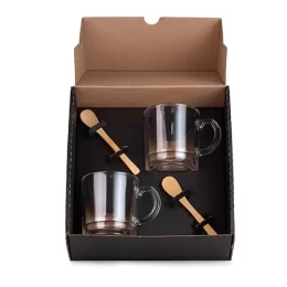 DESCRIÇÃO: Kit contendo uma duas canecas de vidro e duas colheres em bambu.
