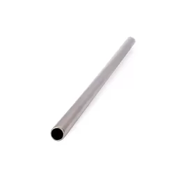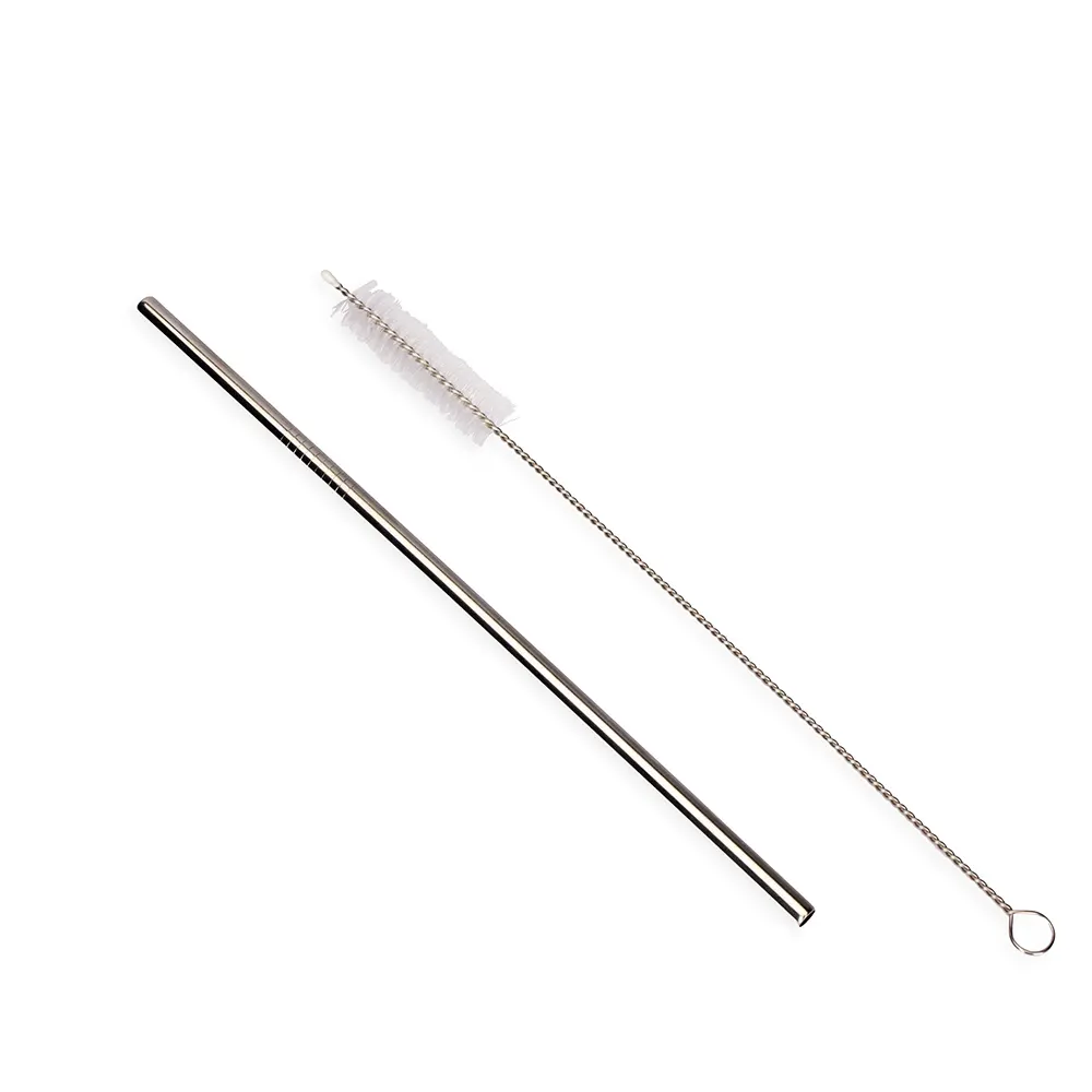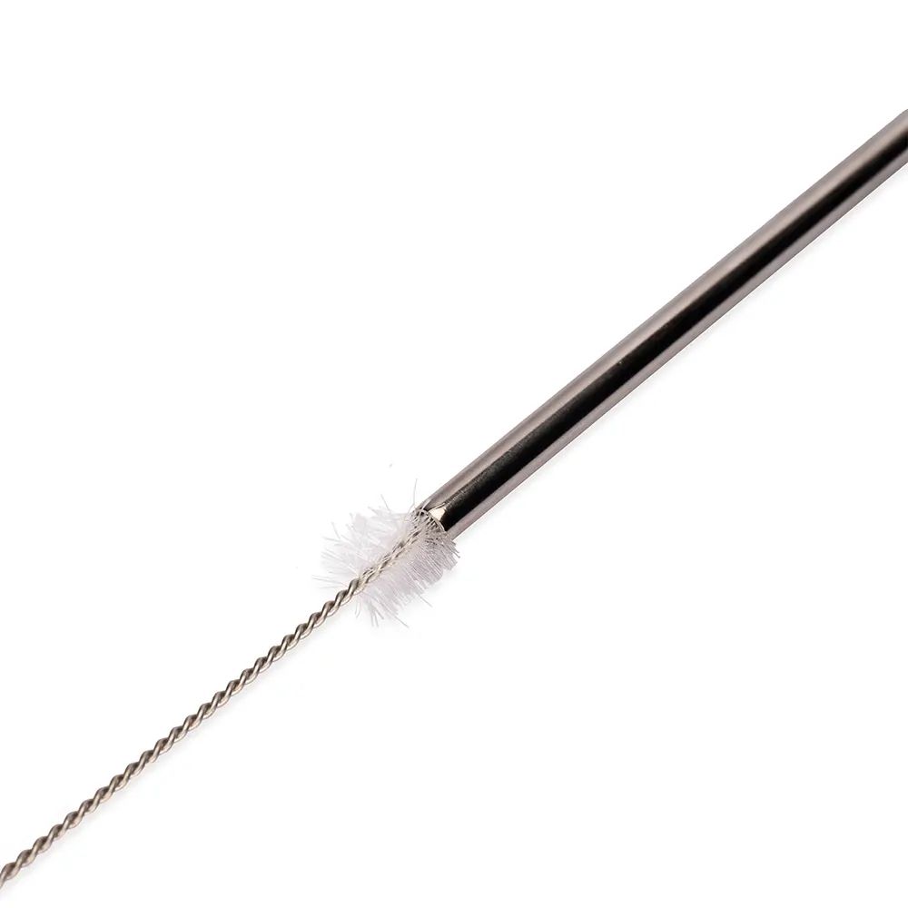 Kit com canudo reto em aço inox e escova de limpeza reutilizável em inox com ponteira plástica e cerdas sintéticas.