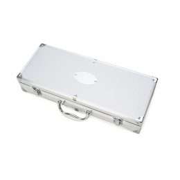 Descrição: Kit churrasco 10 peças em maleta de alumínio com relevo. Possui: faca, pegador, escova(com proteção plástica), garfo, duas facas de serra pequenas, dois garfos pequenos e dois espetos. Detalhes em metal nas bordas da maleta, duas dobradiças na parte inferior, uma alça e duas presilhas para travar/abrir maleta. Parte interna revestida de tecido tnt e velcro para guardar as peças.