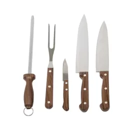 Descrição: O kit perfeito para os verdadeiros amantes de churrasco! Composto por 5 peças em inox com cabos plásticos simulando madeira, nosso kit inclui três facas, sendo de 7”, 6” e 3” polegadas, além de um garfo e uma chaira, todos acomodados em um prático estojo de nylon, ideal para transportar facilmente para qualquer lugar.