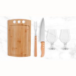 Descrição: Conjunto para Churrasco / Cerveja. Acompanha tábua com três furos em Bambu; faca 8” e garfo em Bambu/Inox; duas taças de cerveja em Vidro; espaço para garrafa com palha.