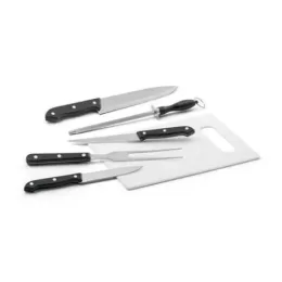 Kit churrasco. Aço inox e PP. Tábua e 5 peças em estojo de 210D. Food grade. Estojo: 350 x 230 x 40 mm | Tábua: 283 x 192 x 5 mm