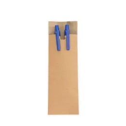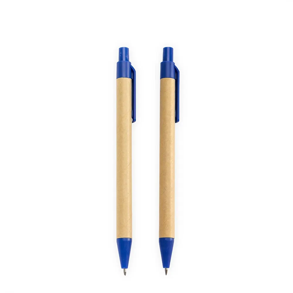 Descrição: Kit de caneta e lapiseira ecológicos com estojo em papelão. A caneta possui corpo em papelão com ponta, clipe e acionamento por clique em plástico, além de carga esferográfica azul de 1,0 mm. A lapiseira segue o mesmo design, equipada com mina de grafite de 0,7 mm.