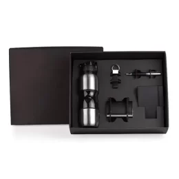 DESCRIÇÃO: Kit escritório composto por squeeze fumê revestido em aço Inox 750ml, caderno para anotações preto com capa dura; caneta, porta-cartão e chaveiro em material sintético preto e metal cromado brilhante.