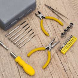 Kit ferramenta 25 peças em estojo plástico resistente texturizado. Possui 2 mini chaves de fenda e 4 mini chaves Philips, adaptador chave de boca, chave canhão, conjunto 10 pontas(4 chaves Philips, 3 chaves fenda, 2 chaves torx e um adaptador), 4 extensores bocais (7MM, 8MM, 9MM e 10MM), pinça, alicate de corte e alicate.