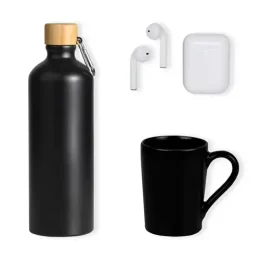 DESCRIÇÃO: Conta com garrafa, caneca em cerâmica preta com capacidade 230 ml e fone de ouvido bluetooth.