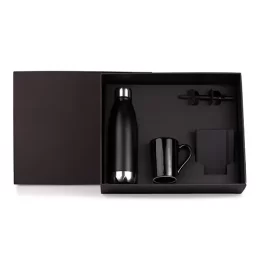DESCRIÇÃO: Kit composto por garrafa em aço Inox preta com tampa rosqueável, caneca em cerâmica preta, caderno para anotações preto com capa dura e caneta esferográfica em ABS preta.