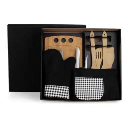 DESCRIÇÃO: Conta com tábua, 4 utensílios em Bambu; faca 8″, faca para pão; faca para desossar e faca para legumes em Bambu/Inox; luva e avental em Brim.