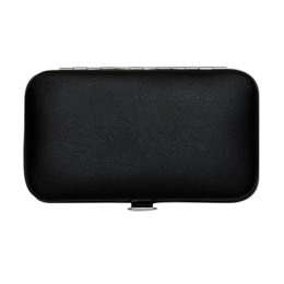 Kit manicure 6 peças em estojo de couro sintético. Possui: lixa, pinça, empurrador de cutícula, cortador de cutícula, tesoura e cortador de unha. Parte interna de plástico com suporte de couro para fixar as peças. Para abrir o estojo basta apertar o botão central.