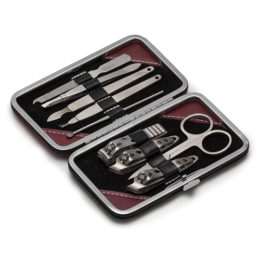Kit manicure 9 peças em estojo de couro sintético com um detalhe em “M” em vermelho, verso preto liso. Parte interna revestida com veludo(suporte de couro para os itens) e detalhes diagonal em couro nas laterais, para abrir basta pressionar o botão central em metal(bordas internas também metálicas). Possui: cortador de cutícula, tesoura, 2 cortadores de unha, empurrador de cutícula, removedor de cutícula, espátula, pinça e lixa(todos itens inteiro metálicos/inox).