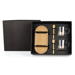 DESCRIÇÃO: Kit para café. Conta com duas canecas em vidro; duas colheres e bandeja em Bambu.
