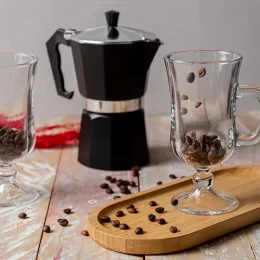DESCRIÇÃO: Kit para café. Conta com cafeteira em alumínio; bandeja em bambu; duas canecas em vidro 240ml cada.