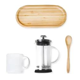 DESCRIÇÃO: Cafeteira prensa francesa em vidro, caneca em cerâmica branca, bandeja com formato oval para servir e colher em bambu de 18 cm.