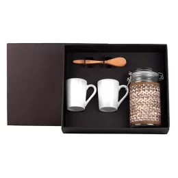 DESCRIÇÃO: Kit para café da manhã. Composto por pote de vidro para mantimento com tampa de fechamento hermético contendo também capacidade para até 1L; duas canecas em cerâmica branca e duas colheres em bambu com tamanho de 18 cm.