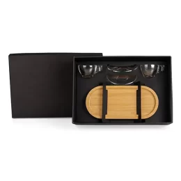DESCRIÇÃO: Kit para Cafézinho. Conta com bandeja em Bambu; Duas xícaras 90ml cada com pires em vidro.