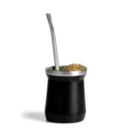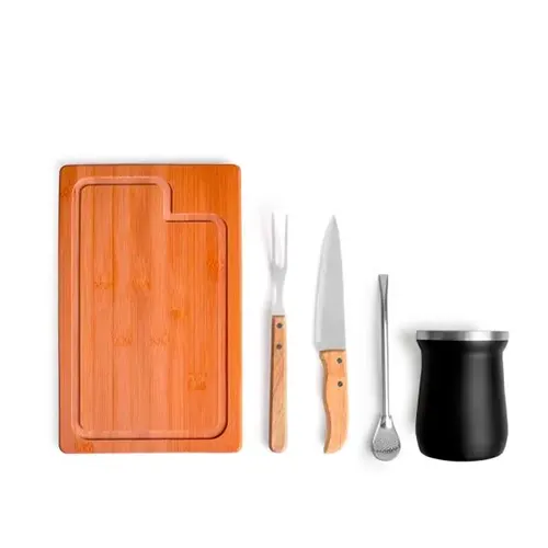 Kit para churrasco. Conta com tábua em Bambu; Faca 7″ e garfo em aço Inox/Madeira; cuia em Aço Inox; bomba para chimarrão / tereré. Tábua confeccionada com tripla camada invertida, para dar maior durabilidade e não deformar com o passar do tempo. Como cortesia, na faca 7″ fazemos uma gravação com os cortes do boi. Cuia confeccionada com dupla parede de inox 300ml. Conta com dupla parede de inox, isoladas a vácuo.
