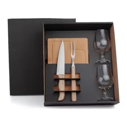 DESCRIÇÃO: Kit para churrasco. Conta com tábua em bambu; duas taças em vidro para cerveja; faca 7″ e garfo trinchante em madeira/inox.