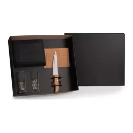 RECOMENDAÇÃO DE PERSONALIZAÇÃO: Uma gravação a Laser na tábua, na lâmina da faca e nos copos.